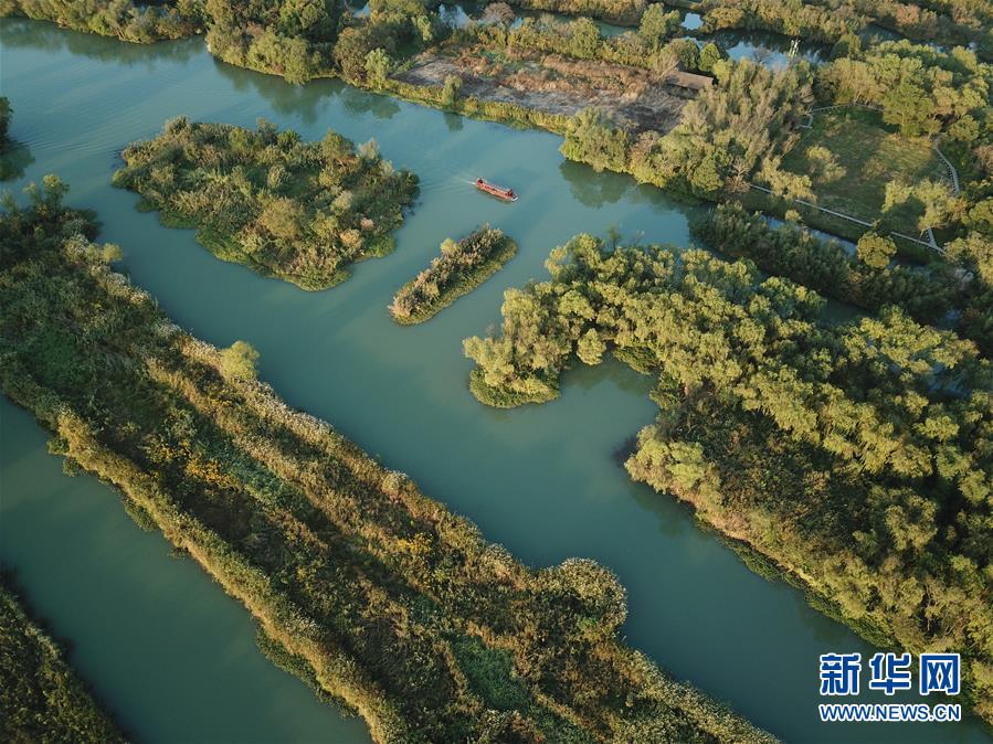 10月29日,游船行駛在西溪濕地河道上(無(wú)人機(jī)拍攝)。新華社記者翁忻旸攝