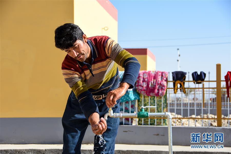 買合肉甫·木拉吧在庭院里洗手。相較于去河里取水,新城里的自來水大大方便了生活(10月28日攝)。新華社記者 關俏俏 攝