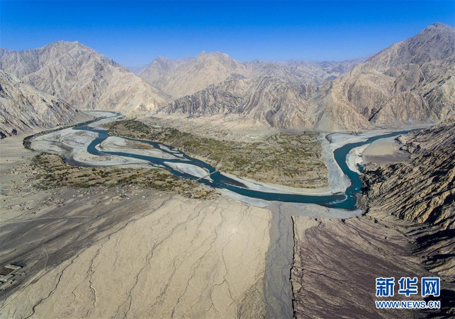 這是位于昆侖山深處的克孜勒蘇柯爾克孜自治州阿克陶縣庫斯拉甫鄉(xiāng),葉爾羌河從村莊流過(10月27日無人機(jī)拍攝)。 新華社記者 關(guān)俏俏 攝