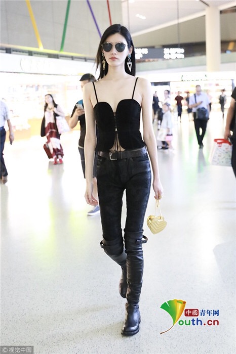 2018年7月25日,上海,奚夢瑤現(xiàn)身機(jī)場,她穿吊帶馬甲配過膝長靴,頻撩發(fā)似女特工。