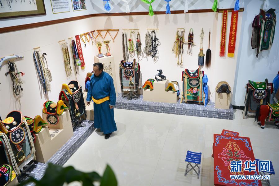 10月31日,在內(nèi)蒙古自治區(qū)通遼市市區(qū),套格敦白乙走過工作室一樓的展廳。新華社記者鄒予攝