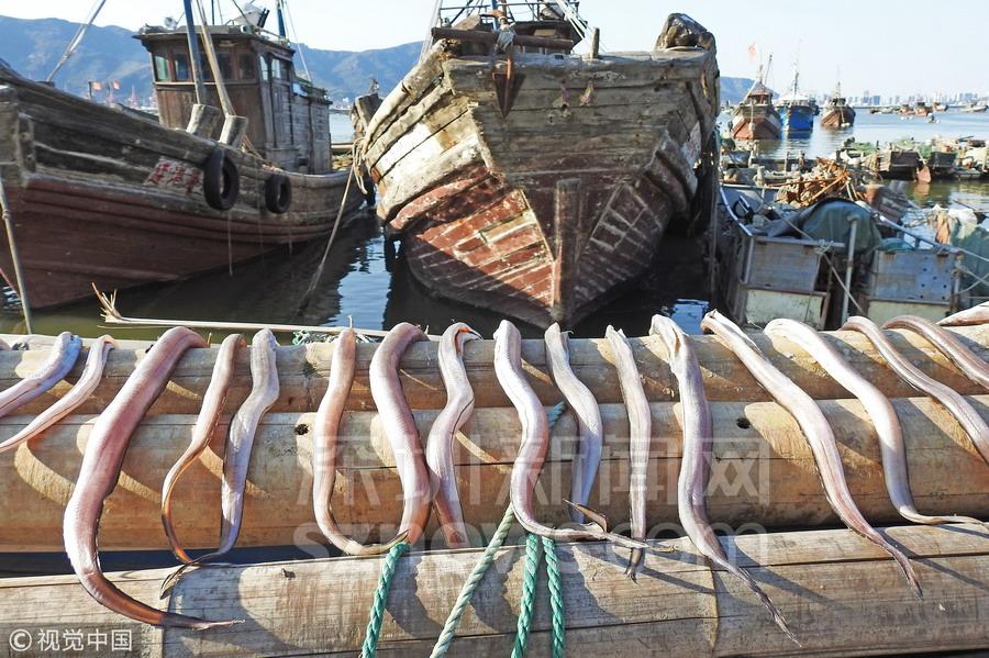 金秋時(shí)節(jié),江蘇連云港市沿海秋捕迎來豐收,漁民們將捕獲的鯧魚、鰻魚、小黃魚、烏賊等經(jīng)過腌制、晾曬加工成魚干,海島處處呈現(xiàn)出一派豐收景象。