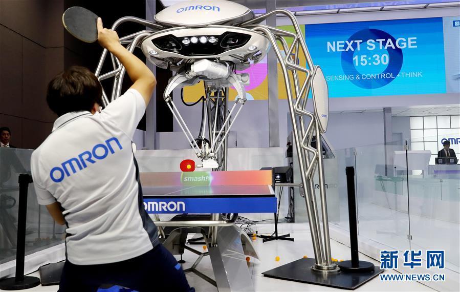 11月5日,一名工作人員在歐姆龍展臺演示與機(jī)器人進(jìn)行乒乓球?qū)?zhàn)。新華社記者 方喆 攝