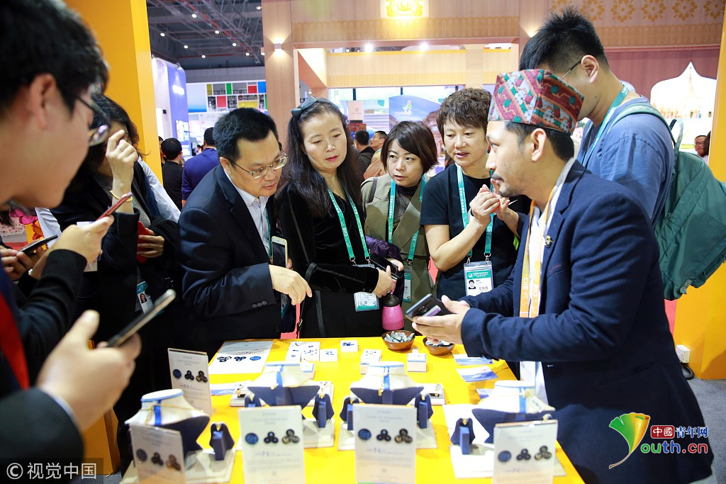 2018年11月6日,上海,首屆中國(guó)國(guó)際進(jìn)口博覽會(huì)國(guó)家展上,共有82個(gè)國(guó)家、3個(gè)國(guó)際組織設(shè)立了71個(gè)展臺(tái)。尼泊爾館。視覺(jué)中國(guó)