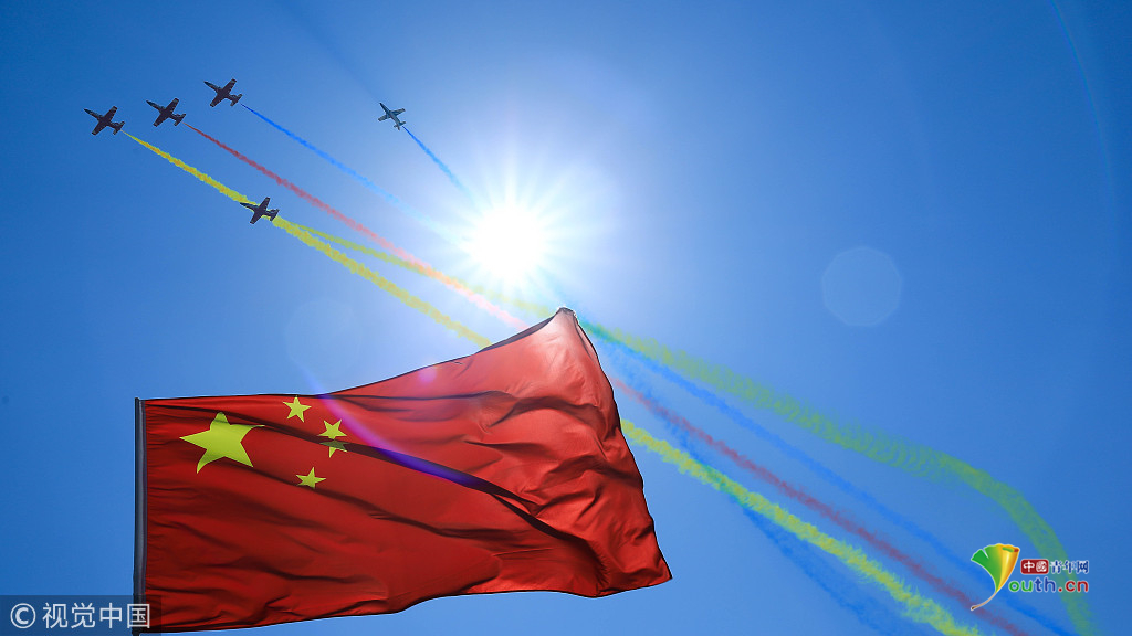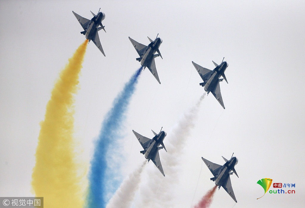 2018年11月8日,廣東珠海,第十二屆中國(guó)國(guó)際航展第三天??哲姟鞍艘弧憋w行表演隊(duì)的隊(duì)員們,發(fā)揚(yáng)連續(xù)作戰(zhàn)精神,給觀眾們表演了七機(jī)分組開(kāi)花、四機(jī)編隊(duì)橫滾等高難動(dòng)作,受到觀眾們的稱贊。視覺(jué)中國(guó)