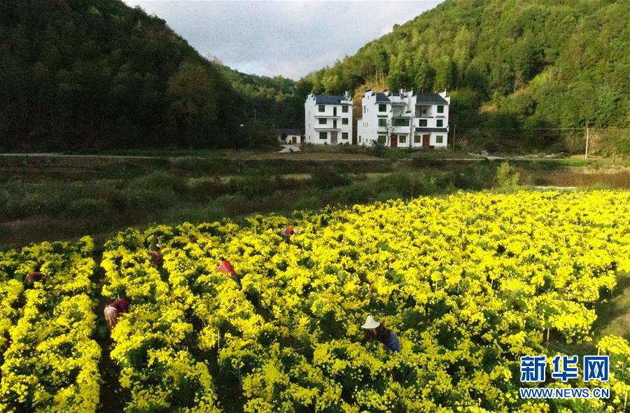 11月8日,婺源縣思口鎮(zhèn)農戶在采摘皇菊(無人機拍攝)。 新華社記者 胡晨歡 攝