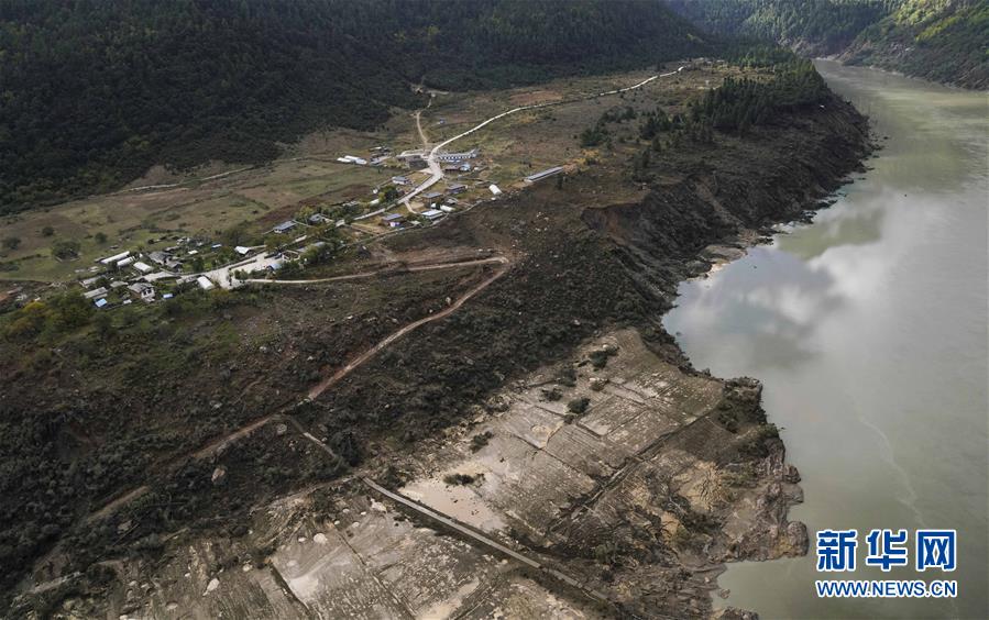 10月20日拍攝的西藏雅魯藏布江米林縣堰塞湖自然過(guò)流后的加拉村。 10月19日13時(shí)30分,西藏雅魯藏布江米林縣堰塞湖開(kāi)始自然過(guò)流。記者從應(yīng)急管理部牽頭的聯(lián)合工作組獲悉,截至20日7時(shí),雅魯藏布江堰塞湖壩前水位已下降56米,估算留存水量1.6億立方米,堰塞湖洪水威脅得到緩解,防洪安全風(fēng)險(xiǎn)大大減輕,并將繼續(xù)降低。 10月20日,記者乘坐直升機(jī)從空中拍攝了雅魯藏布江堰塞湖自然過(guò)流的畫(huà)面。 新華社記者普布扎西攝