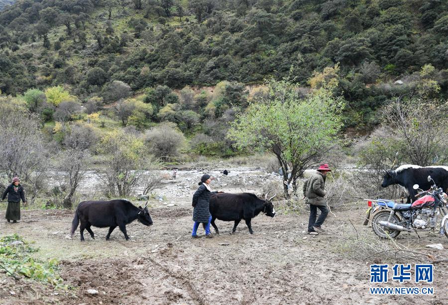 波羅鄉(xiāng)一臨時(shí)過(guò)渡安置點(diǎn)內(nèi)的群眾在放牛(10月14日攝)。 新華社記者 劉東君 攝