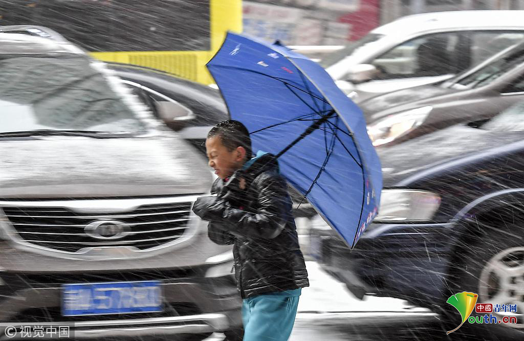 2018年11月12日,持續(xù)濃霧天氣的新疆烏魯木齊市,又迎來一場雨雪天氣,氣溫隨之驟降。圖為一名男孩打著雨傘與風雪“抗爭”。圖片作者:劉新