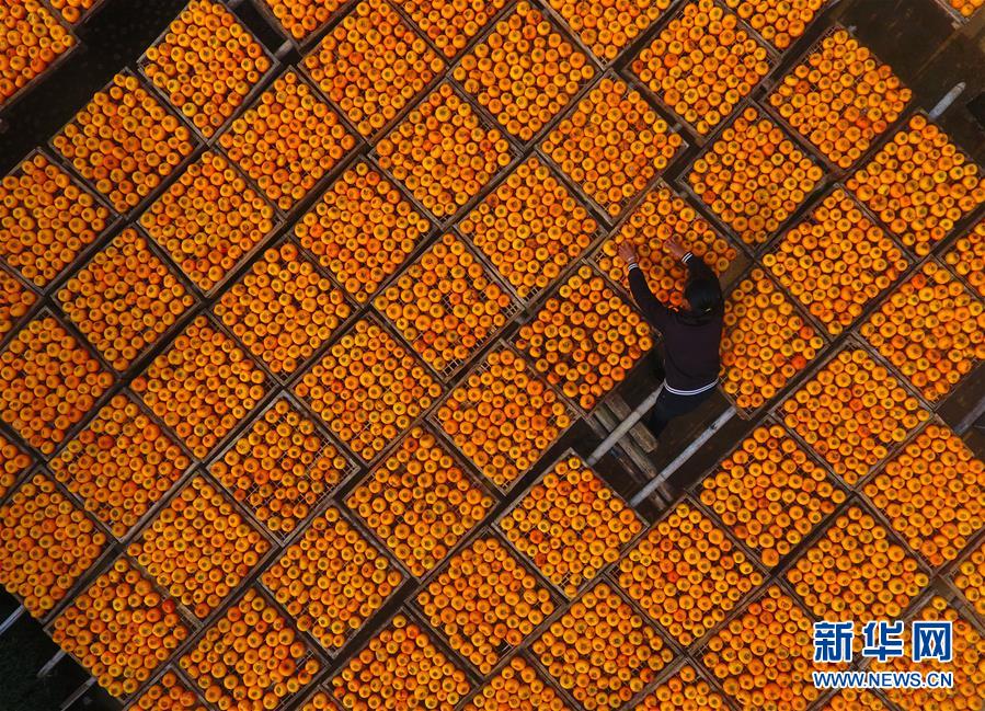 10月17日,廣西桂林市平樂(lè)縣沙子鎮(zhèn)渡河村農(nóng)民在晾曬柿子(無(wú)人機(jī)拍攝)。 金秋時(shí)節(jié),農(nóng)民們忙著收獲成熟的農(nóng)作物,喜迎豐收。 新華社記者 黃孝邦 攝