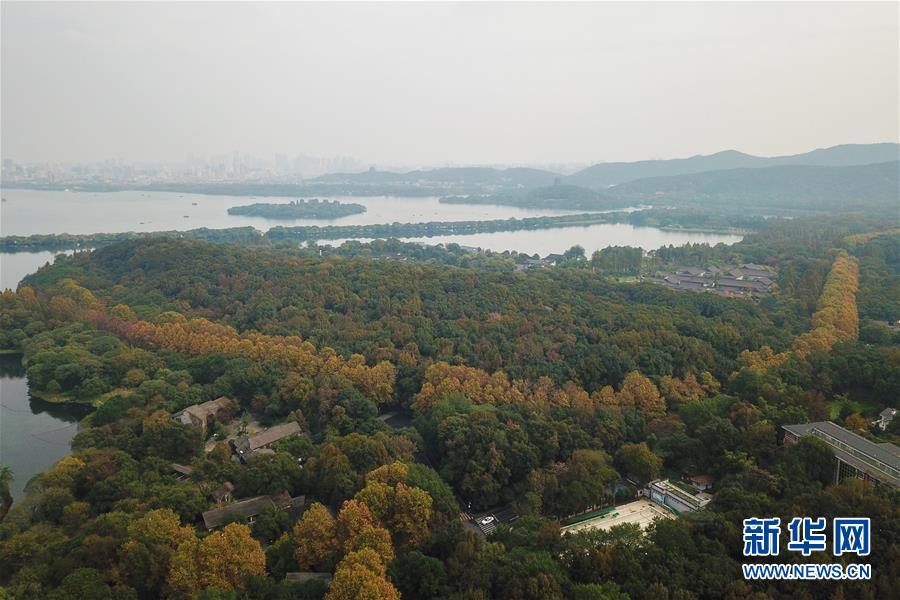 11月13日無人機(jī)拍攝的杭州西湖一景。 時值初冬,杭州市西湖景區(qū)層林盡染,色彩斑斕,別有一番韻味。