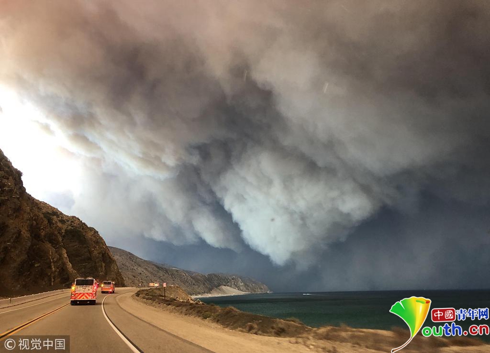 當?shù)貢r間11月9日下午,美國加利福尼亞州南部文圖拉郡(Ventura County)等地熊熊山火已延燒逾萬英畝,濃煙遮天蔽日。