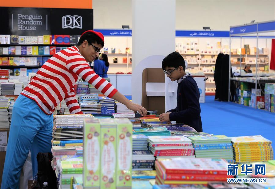 11月14日,在科威特國(guó)際展覽中心,工作人員(左)向一個(gè)男孩介紹圖書。 第43屆科威特國(guó)際書展14日在科威特國(guó)際展覽中心開幕,共有來(lái)自26個(gè)國(guó)家和地區(qū)的505家出版機(jī)構(gòu)參展。 新華社記者 聶云鵬 攝
