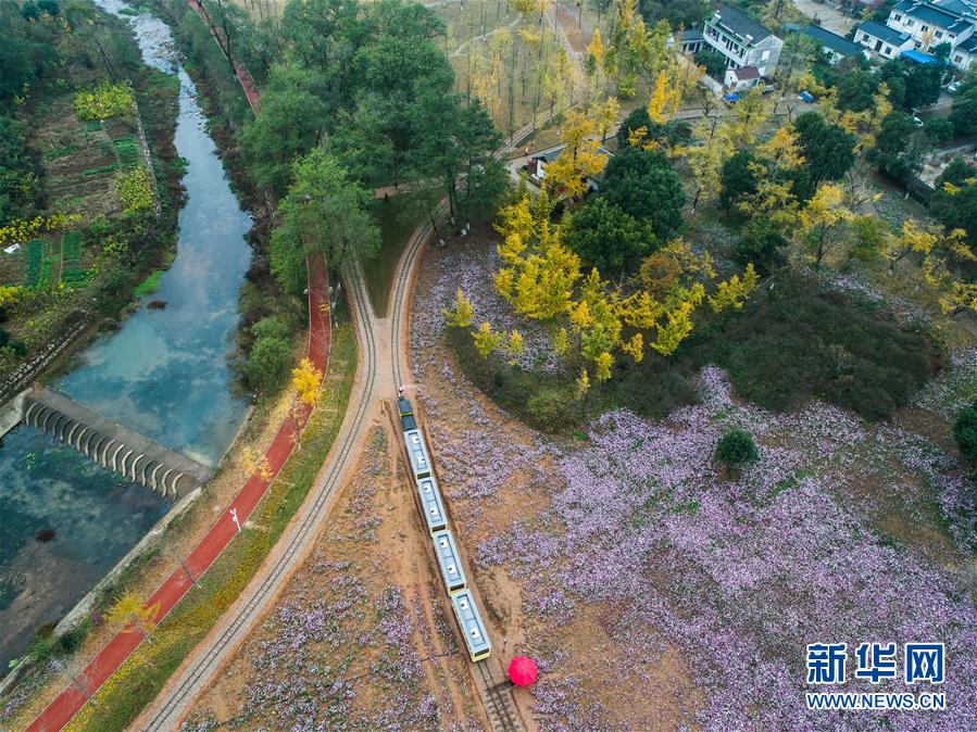 一列觀光小火車(chē)帶著游客穿行在銀杏林和花海之間(11月16日無(wú)人機(jī)拍攝)。近日,在浙江省長(zhǎng)興縣小浦鎮(zhèn),“十里銀杏長(zhǎng)廊”和近千畝花海經(jīng)過(guò)近一年的升級(jí)改造后,以嶄新的面貌與游客見(jiàn)面?;ê!⒂^光小火車(chē)、古村民宿、銀杏長(zhǎng)廊等旅游項(xiàng)目全面提升了小浦鎮(zhèn)鄉(xiāng)村旅游的品質(zhì)。新華社記者 徐昱 攝