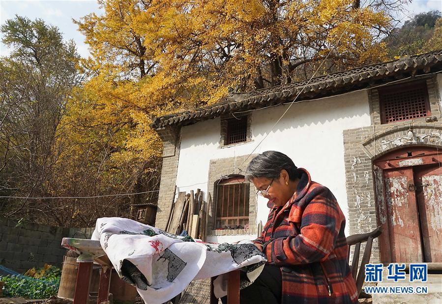 11月1日,河南省嵩縣白河鄉(xiāng)下寺村的一位村民在自家門前制作刺繡工藝品。 深秋時(shí)節(jié),河南省嵩縣白河鄉(xiāng)下寺村的古銀杏林為小山村披上了“金甲”。漫天黃葉,遍地金色,一幢幢民居掩映在色彩斑斕的世界里,美不勝收,吸引了眾多游客賞景拍照。 新華社記者 李安 攝