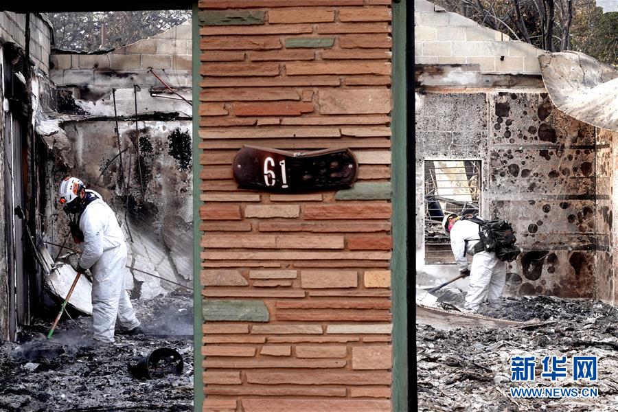 11月20日,在美國(guó)加利福尼亞州比尤特縣天堂鎮(zhèn),救援人員在山火廢墟中工作。