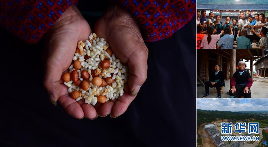 拼版照片:左圖為在廣西融水雙龍溝森林旅游度假區(qū)夢(mèng)嗚苗寨,70歲的韋院媽手捧油茶原料:花生、油果、蔭米(11月20日攝);右上圖為韋院媽(左六)在景區(qū)里和游客們一起歡度苗族新禾節(jié)(7月18日攝);右中圖為韋院媽(右)在家里休息(11月20日攝);右下圖為夢(mèng)嗚苗寨(7月19日無人機(jī)拍攝)。韋院媽是桿洞鄉(xiāng)錦洞村的貧困戶,今年3月,她和村里的13戶貧困戶一起舉家搬到雙龍溝森林旅游度假區(qū)打造的夢(mèng)嗚苗寨,景區(qū)將貧困戶引入苗寨生活工作,保證貧困家庭有穩(wěn)定的收入。 廣西融水苗族自治縣是國(guó)家扶貧工作重點(diǎn)縣,全縣“九山半水半分田”,生活生產(chǎn)環(huán)境較為惡劣,脫貧攻堅(jiān)任務(wù)艱巨,目前還有7.68萬貧困人口。面對(duì)經(jīng)濟(jì)發(fā)展落后、貧困面廣且程度深的現(xiàn)狀,當(dāng)?shù)匕衙撠毠?jiān)與創(chuàng)新產(chǎn)業(yè)扶持相結(jié)合,依托生態(tài)資源優(yōu)勢(shì),實(shí)施“特色產(chǎn)業(yè)富民行動(dòng)”,通過發(fā)展特色民族旅游、林下經(jīng)濟(jì)和特色養(yǎng)殖業(yè)等扶貧產(chǎn)業(yè),帶動(dòng)貧困群眾依靠勤勞的雙手,拔窮根摘窮帽,實(shí)現(xiàn)脫貧致富。據(jù)了解,目前全縣貧困戶參與特色產(chǎn)業(yè)發(fā)展的有2.9萬戶,扶貧產(chǎn)業(yè)覆蓋率達(dá)95%。 新華社記者 黃孝邦 攝