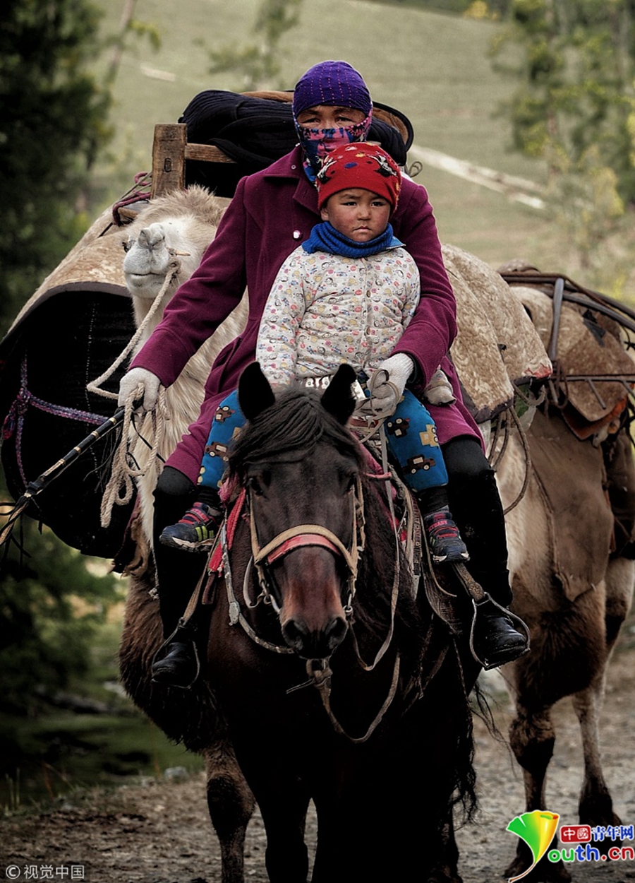 族牧民整理好行裹,抱著孩子,趕著牛羊,浩浩蕩蕩向秋牧場遷徙。