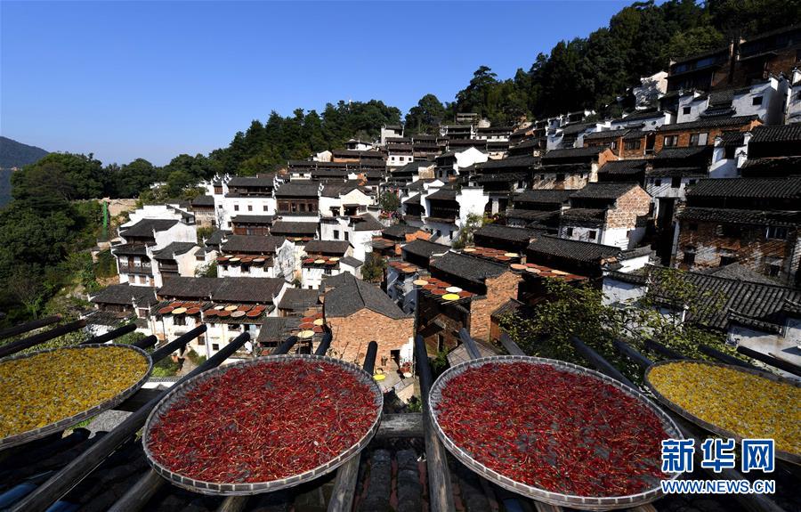 2017年10月26日拍攝的篁嶺古村。家家戶(hù)戶(hù)晾曬各種蔬果及皇菊。近日天氣晴朗,江西省婺源縣江灣鎮(zhèn)篁嶺村村民抓住時(shí)機(jī)采摘、晾曬皇菊及蔬果。明黃的菊花、火紅的辣椒……各種顏色將篁嶺古村裝扮成巨大的“調(diào)色板”,引來(lái)眾多游客感受鄉(xiāng)村美景。新華社記者宋振平 攝
