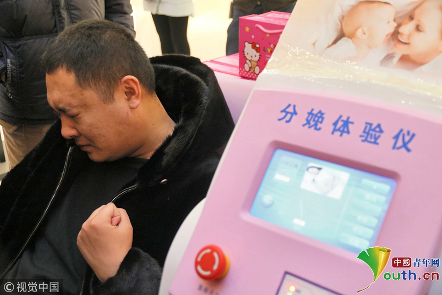 2018年3月8日,一名男士在山東煙臺大悅城通過“分娩體驗(yàn)儀”感受“分娩”時(shí)的陣痛。