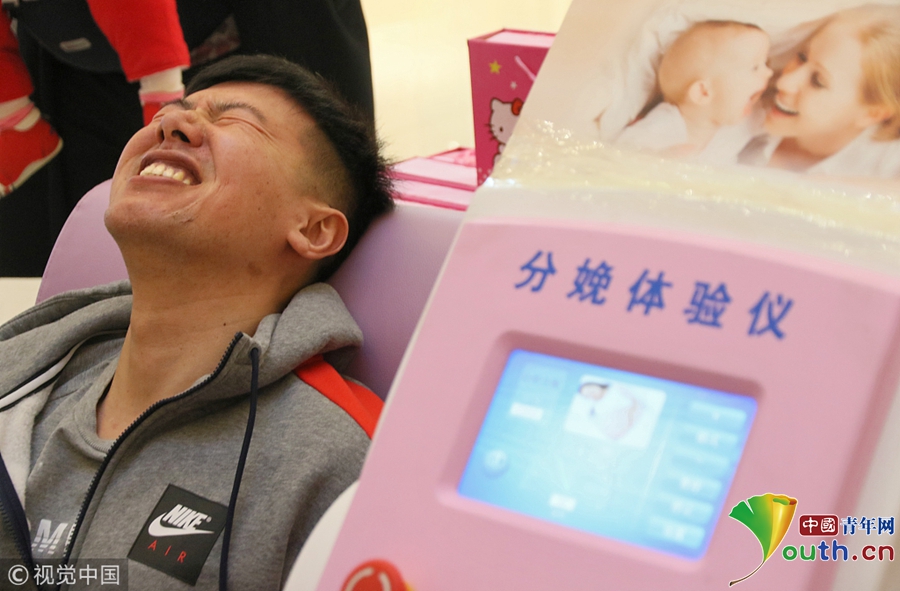 2018年3月8日,一名男士在山東煙臺(tái)大悅城通過(guò)“分娩體驗(yàn)儀”感受“分娩”時(shí)的陣痛。