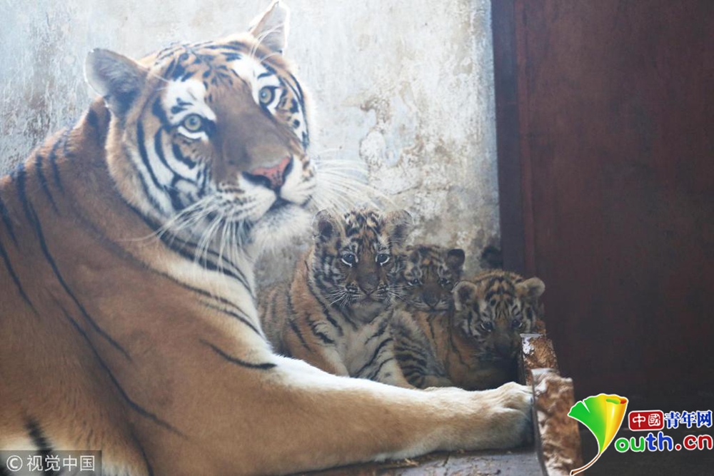 剛出生一個(gè)多月的小東北虎和“虎媽”在一起。