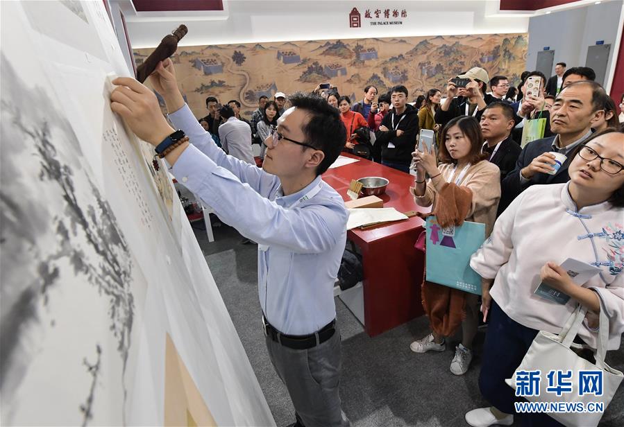 11月23日,參觀者(左一)在中國文字博物館展臺前體驗(yàn)?zāi)镜癜嬗∷⒐に?。新華社記者李賀攝