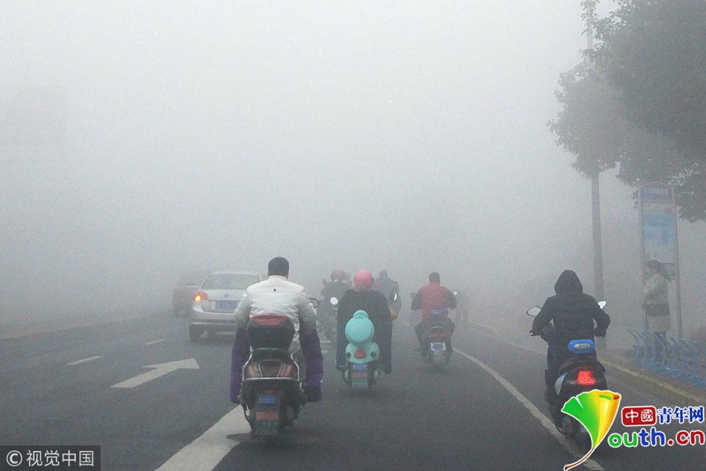 2018年11月26日,江蘇常州的市民在大霧籠罩下緩慢出行。