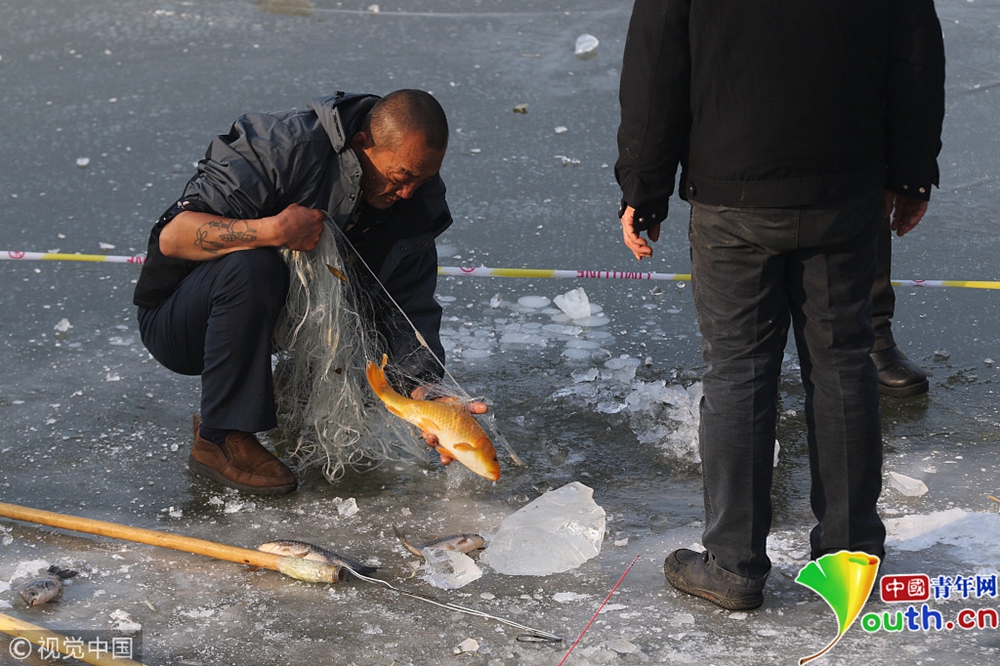 2018年11月25日,黑龍江省哈爾濱市,松花江封江不久,已經(jīng)有人蹬江鑿冰下網(wǎng)捕魚。 圖片來(lái)源:視覺(jué)中國(guó)