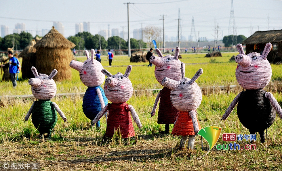 2018年12月1日,上海。上海嘉北郊野公園的一片農(nóng)田近日成了“網(wǎng)紅”。在這片收割過的早稻田里,小豬佩奇、獅子、大象等20多個(gè)稻草雕塑在農(nóng)田中安營扎寨。圖片來源視覺中國