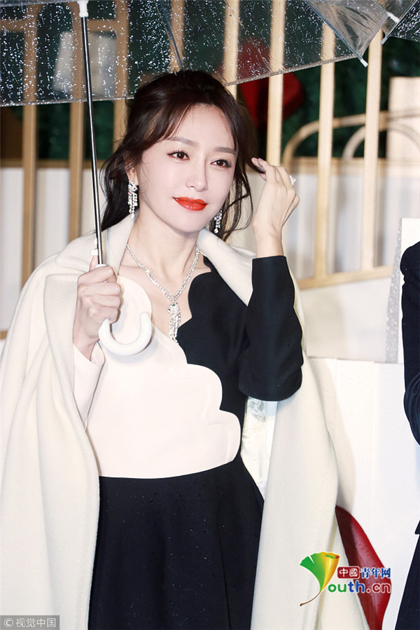秦嵐撐傘雪膚紅唇美如畫 優(yōu)雅品香檳氣質(zhì)高貴迷人