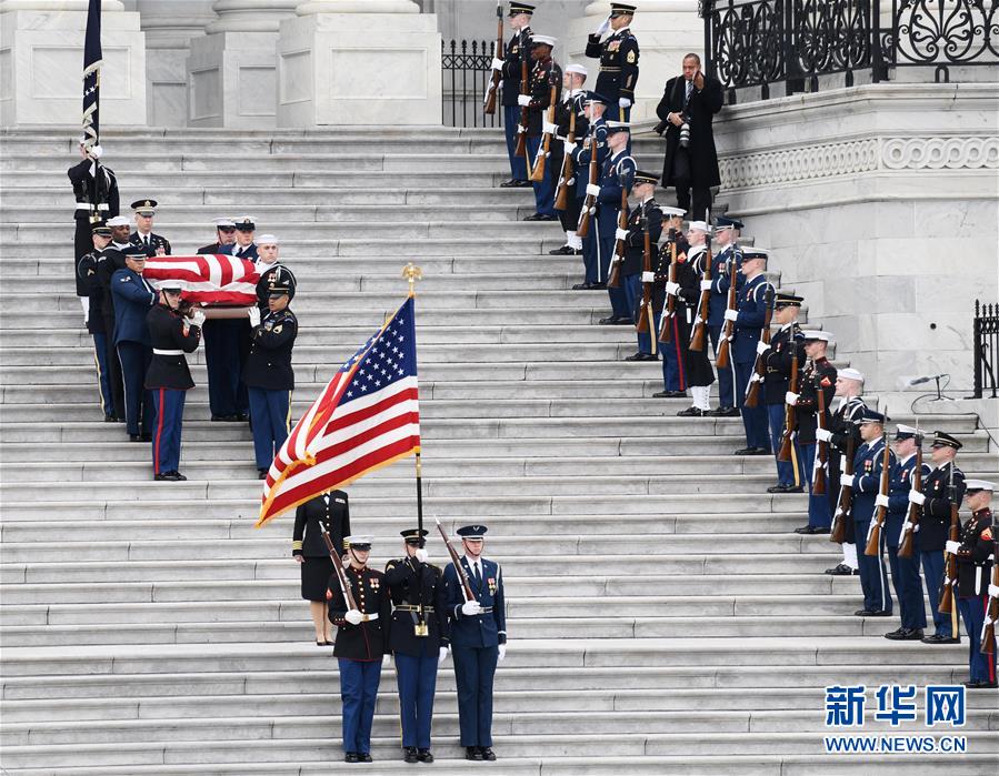 12月5日,在美國首都華盛頓,美國前總統(tǒng)喬治·赫伯特·沃克·布什的靈柩被安放在國會大廈前的靈車上。