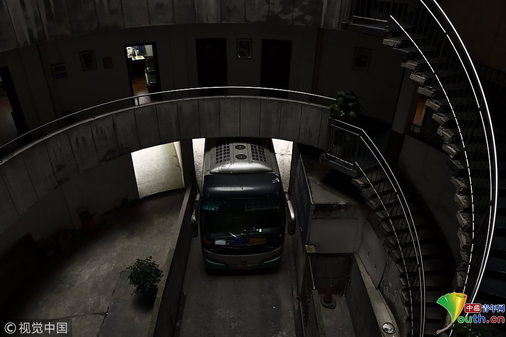 2018年12月6日,重慶江北紅旗河溝汽車(chē)站內(nèi),有一棟獨(dú)特的八層圓環(huán)狀建筑,底層每天有不少進(jìn)出站的客車(chē)通行。據(jù)悉,這棟樓建于1990年,曾經(jīng)是車(chē)站旅館,如今一、二兩層用于車(chē)站辦公,其余樓層已廢棄。為確保安全,三層以上已經(jīng)被封鎖。圖為公交車(chē)穿過(guò)8層空心圓筒樓。徐勇/視覺(jué)中國(guó)
