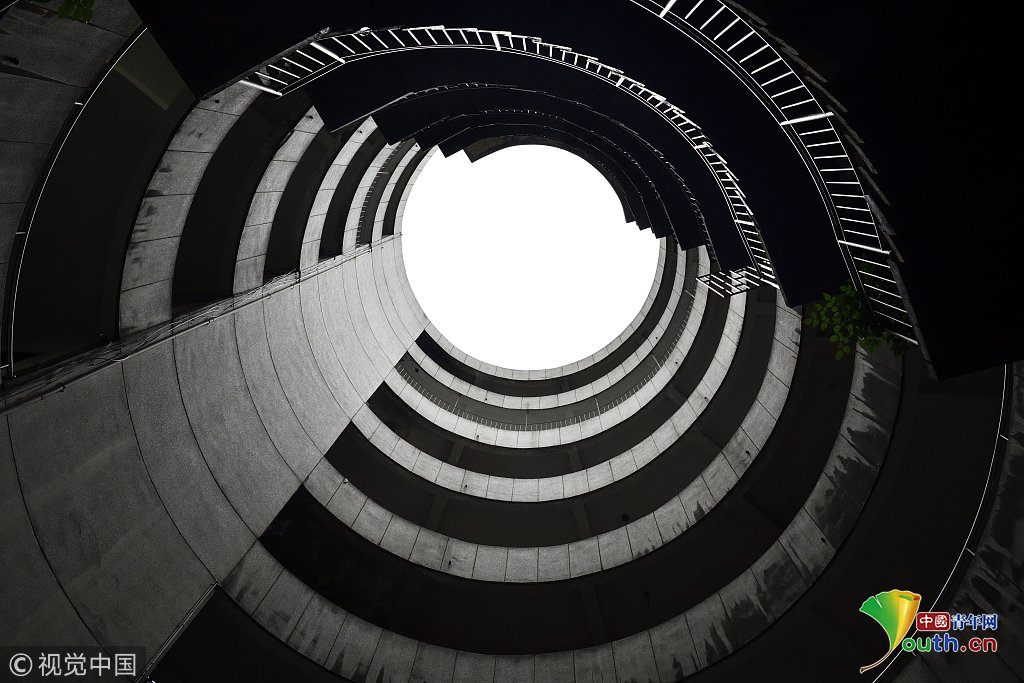 2017年9月27日,重慶,南岸區(qū)某小區(qū)的“螺旋”停車(chē)場(chǎng),從公路到車(chē)庫(kù)要下5層樓,司機(jī)需要轉(zhuǎn)無(wú)數(shù)個(gè)360度圈。圖片來(lái)源:視覺(jué)中國(guó)