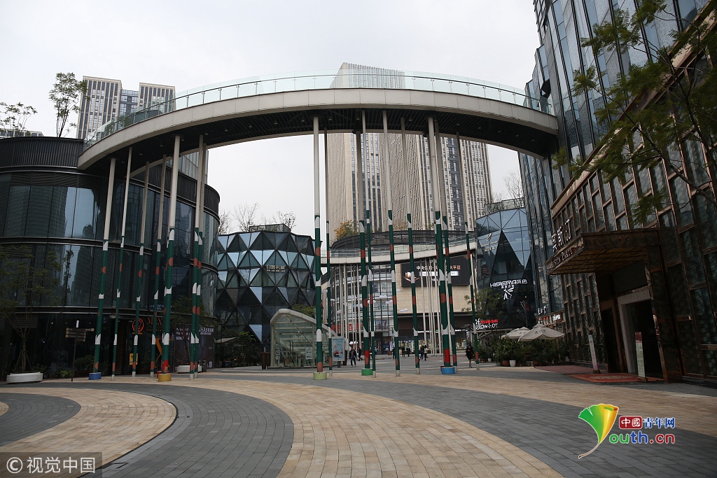 2017年3月16日,重慶,渝中區(qū)一棟大樓從22層架起兩座平行的天橋,連接對(duì)面的魁星樓廣場(chǎng)地面。圖片來源:視覺中國(guó)