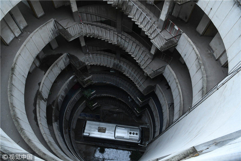 2017年9月27日,重慶,南岸區(qū)某小區(qū)的“螺旋”停車場(chǎng),從公路到車庫(kù)要下5層樓,司機(jī)需要轉(zhuǎn)無數(shù)個(gè)360度圈。圖片來源:視覺中國(guó)