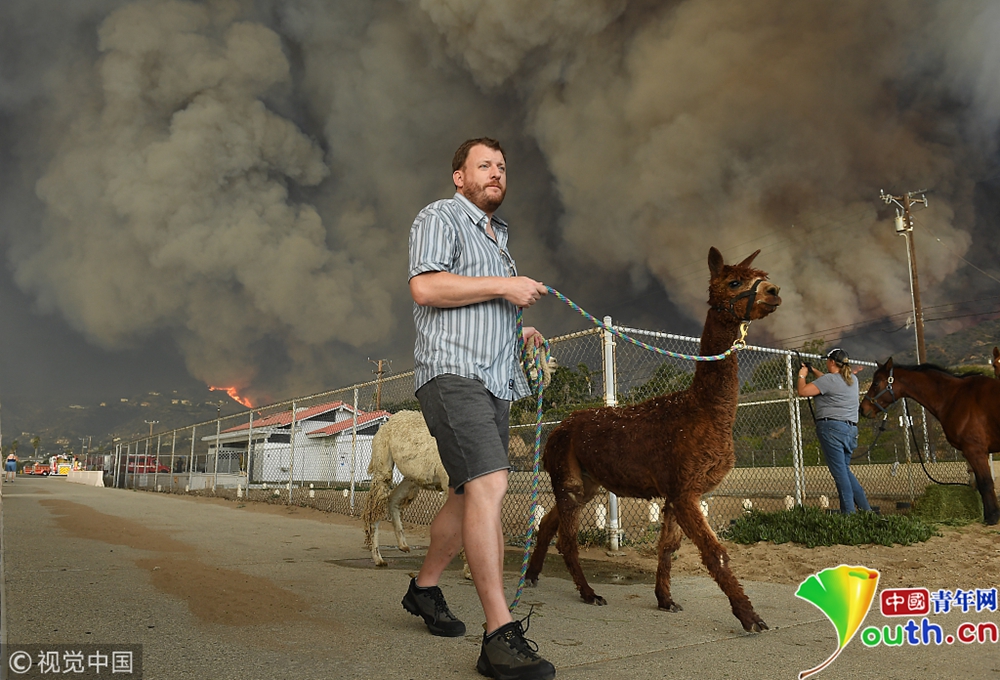 當?shù)貢r間2018年11月10日,美國加州Paradise,當?shù)厣交鹚僚埃瑸膮^(qū)民眾紛紛帶領(lǐng)家畜進行轉(zhuǎn)移。自本周三開始,加州多地發(fā)生山火,火勢蔓延迅猛,數(shù)萬人被迫撤離,數(shù)以萬計的房屋被燒毀。圖片作者:Jessica Christian