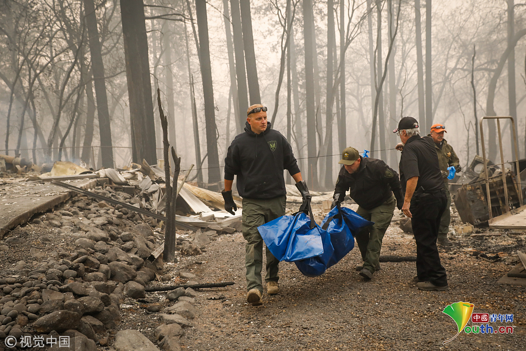 11月13日,在美國加利福尼亞州天堂鎮(zhèn),搜救人員在山火過后的廢墟工作。