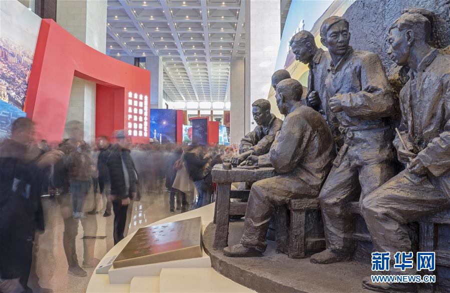 11月18日,觀眾在觀看安徽小崗村農(nóng)民按下包產(chǎn)到戶“紅手印”的雕塑(慢門拍攝)。新華社記者 才揚(yáng) 攝