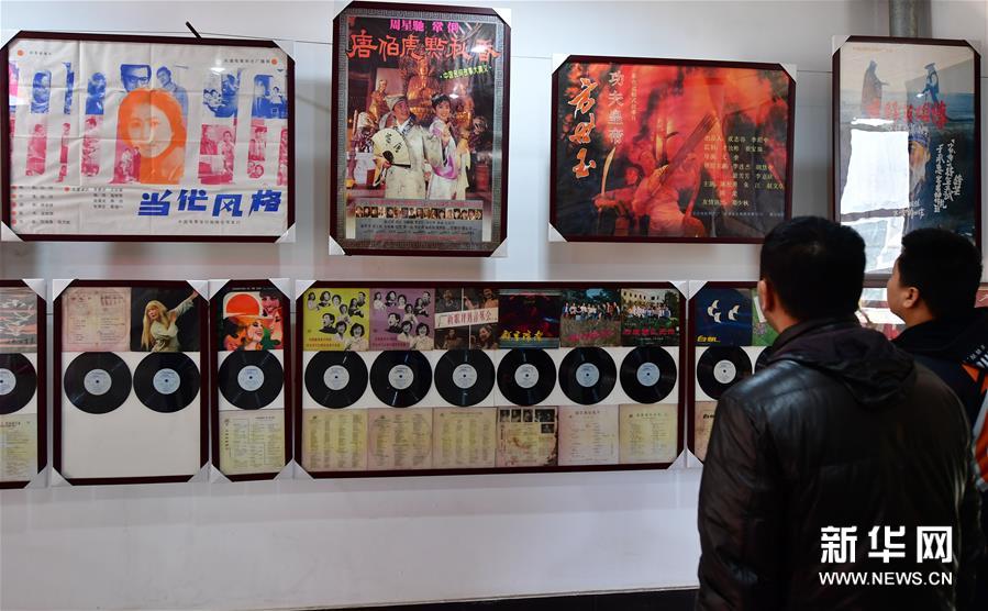 12月12日,觀眾在洛陽隋唐百戲城觀看展出的電影海報與老唱片。新華社記者馮大鵬攝
