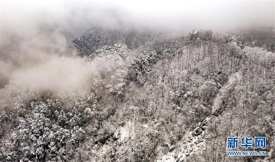 11月8日無人機(jī)拍攝的銀裝素裹的鬼谷嶺國家森林公園主峰。 新華社記者陶明攝
