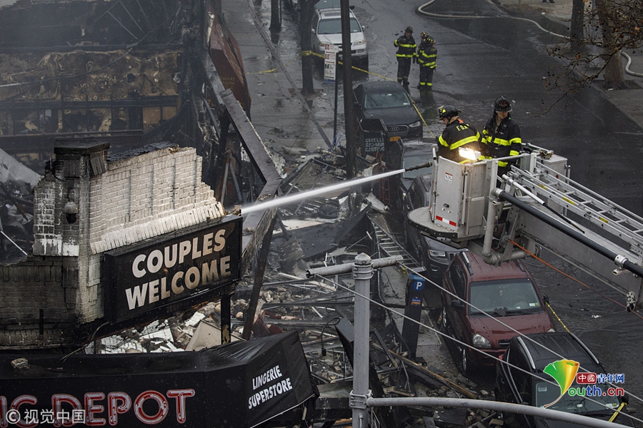 當?shù)貢r間2018年12月13日,美國紐約,在紐約皇后區(qū)皇后大道,一場大火吞噬了六家商鋪,消防隊員正在努力撲滅火災余燼。十幾人受傷,包括6名消防員。起火原因仍在調查中。圖片作者:Drew Angerer