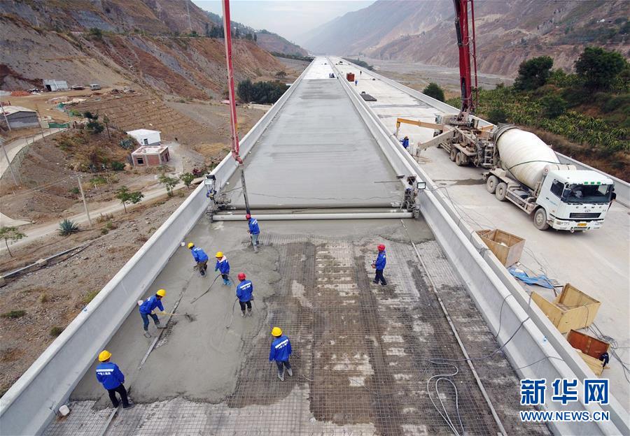12月15日,中鐵上海局集團(tuán)公司的施工人員在東格高速公路土建項(xiàng)目中進(jìn)行橋面鋪裝作業(yè)(無(wú)人機(jī)拍攝)。 新華社記者楊宗友攝