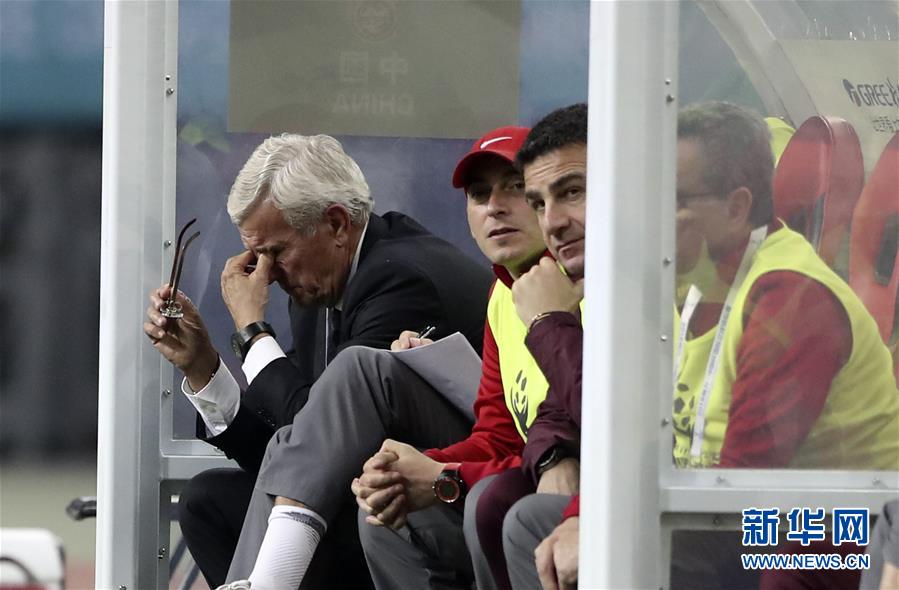 圖為2018年3月22日,中國隊(duì)主教練里皮(左一)在2018中國杯國際足球錦標(biāo)賽中球隊(duì)失球后的資料照片。 新華社記者曹燦攝