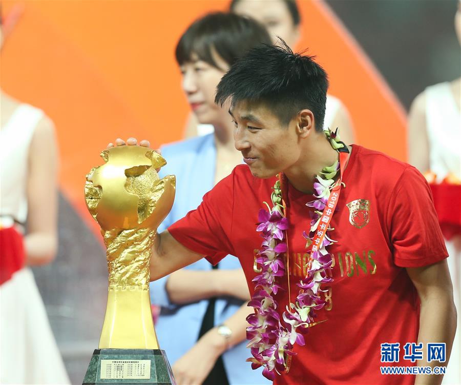 圖為2018年11月7日,上海上港隊(duì)球員武磊在球隊(duì)提前一輪奪得2018年中超聯(lián)賽冠軍后撫摸火神杯的資料照片。 新華社記者丁汀攝