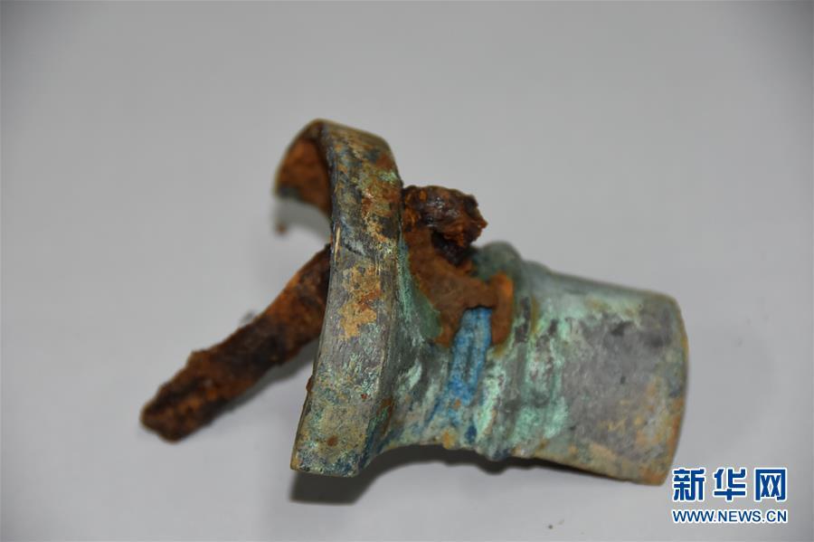吳山祭祀坑內出土的祭祀用的青銅車軎(12月7日攝)。 新華社記者都紅剛攝