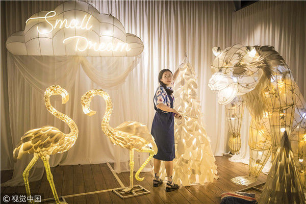 2018年5月6日,廣州,在天河區(qū)一家大商場(chǎng)辦個(gè)展時(shí),用紙片做成的北極熊、大松樹、火烈鳥、紙房子在光線的配合下美輪美奐,吸引了很多顧客駐足?!皫缀趺總€(gè)人一看到,都會(huì)走進(jìn)那個(gè)夢(mèng)幻的場(chǎng)景里,和這些紙雕一起合影。”圖片攝于2018年5月6日。南塘/視覺中國(guó)
