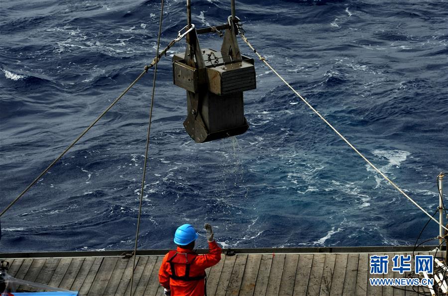 科考團隊成員在船上回收箱式采樣器(12月20日攝)。