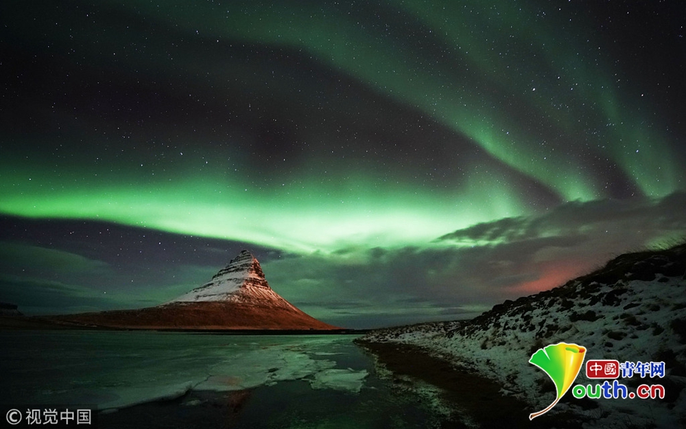 近日,冰島西海岸高463米的Kirkjufell山上空出現(xiàn)極光。