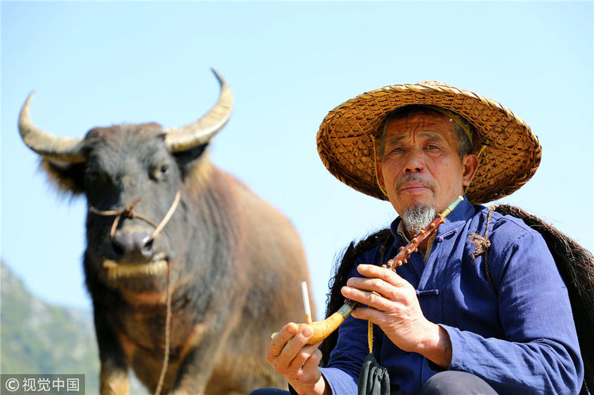 2018年12月17日,廣西桂林。用不到3年時(shí)間,農(nóng)民許修保愣是將自己家的水牛訓(xùn)練得走上了貓步,這讓來(lái)自全國(guó)各地的游客嘖嘖稱奇:你這么牛,維密天使情何以堪?憑著與水牛的聯(lián)袂演出,一個(gè)月下來(lái),老許會(huì)有兩三萬(wàn)的收入進(jìn)賬,佩服得左鄰右舍紛紛向他伸出了大拇指。棋簿紫/視覺(jué)中國(guó)